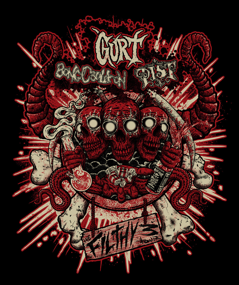 Promotional design for the tour featuring the bands Gurt, Bongcauldron and Pist. This is to be used as a poster and t-shirt design.