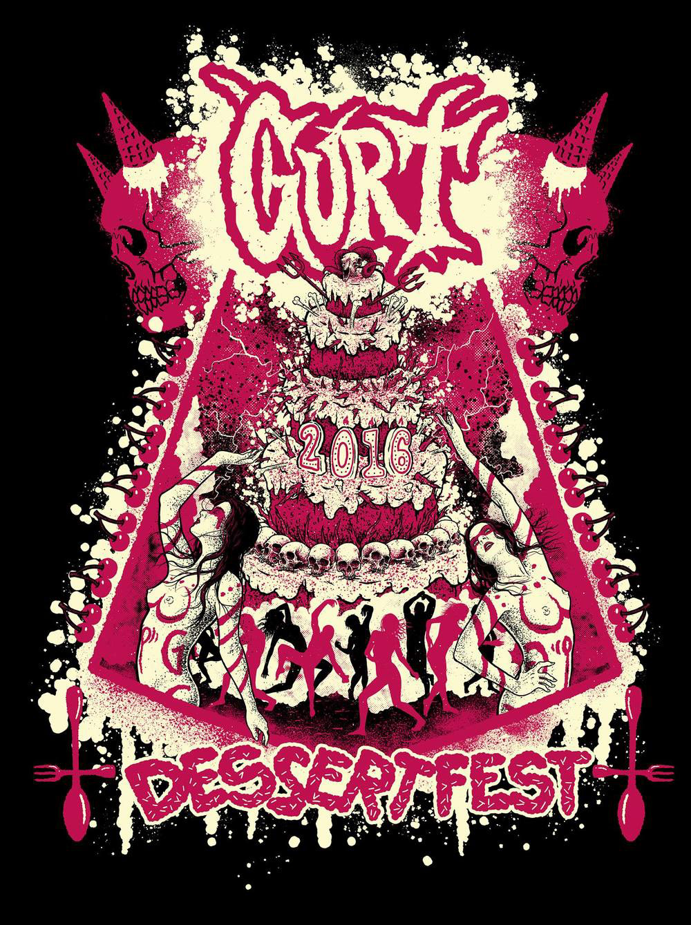 Shirt design for Gurt for Des(s)ertfest 2016. This version was actually changed by the band to a more simple design with some of the elements removed to focus on the cake.