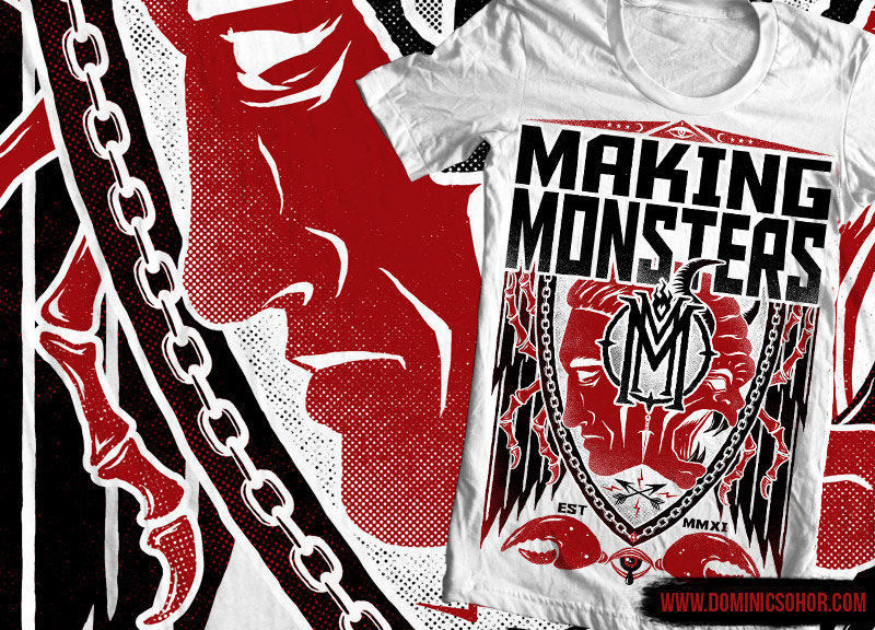 I was delighted to be asked to create another design for Making Monsters ahead of them heading out on their first UK tour. For this design, the band wanted to draw on the previous imagery created for them but in a more graphic style than some of my other work and I'm pleased with the result, as are the band (which is the important thing!) This shirt will be on sale in two colourways on their upcoming tour with Max Raptor and Fort Hope.